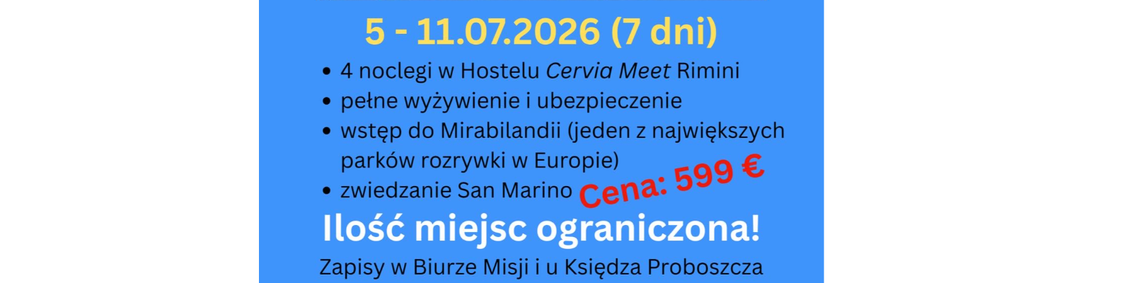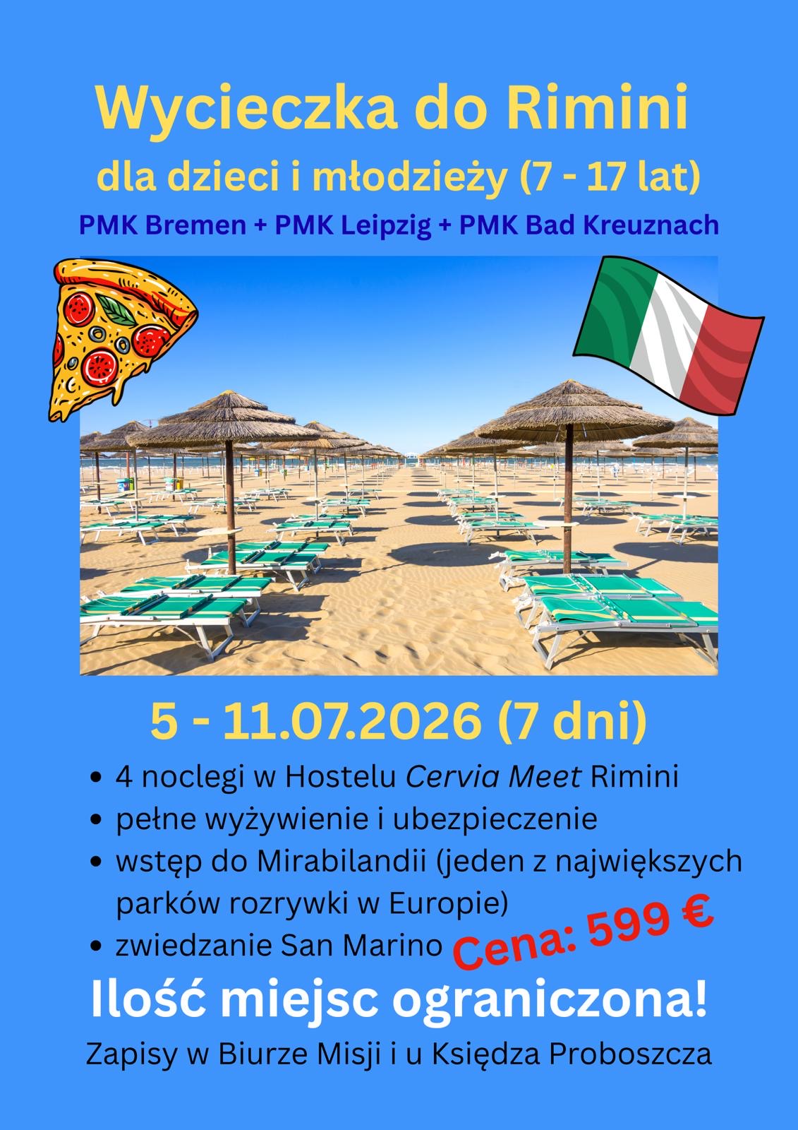 Szanowni Państwo,księża oraz duszpasterze Polskich Misji Katolickich w Bremen, Leipzig i Bad Kreuznach organizują letni wyjazd młodzieży do Rimini/Cervia nad Adriatykiem, który odbędzie się w dniach 05–11 lipca 2026.